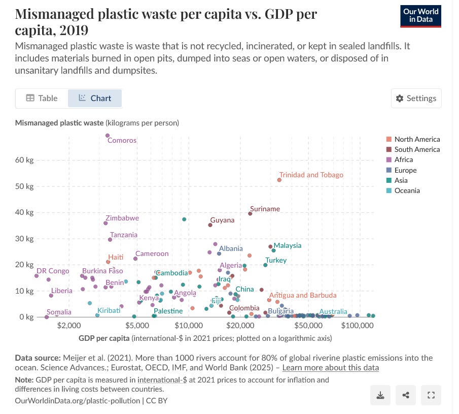 Ecomafia gives us a specific explanation for southern Italy, but what explains the variation in the amounts of litter on the streets among the countries in the world? I asked ChatGPT about it, but it was unable to find any good academic analyses of cross-national patterns. It did, however, point me to the chart by Our World in Data, Mismanaged plastic waste per capita vs. GDP per capita, 2019, which is reproduced below.