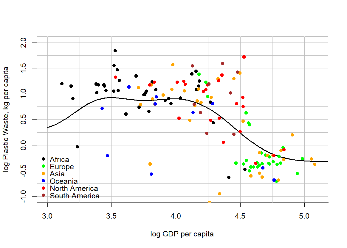There is a lot of variation, but the overall pattern is pretty clear. For the range of log GDPpc between 3 and 4.5 (that is between $1,000 and $30,000) countries generate around 10 kg of mismanaged plastic waste per person. Once you get above GDPpc of $30,000, production of mismanaged waste drops quickly to around 0.5 kg per person. Interestingly, this transition is seen not only in Europe (green dots) and North America (red dots), but also in Asia (orange dots).