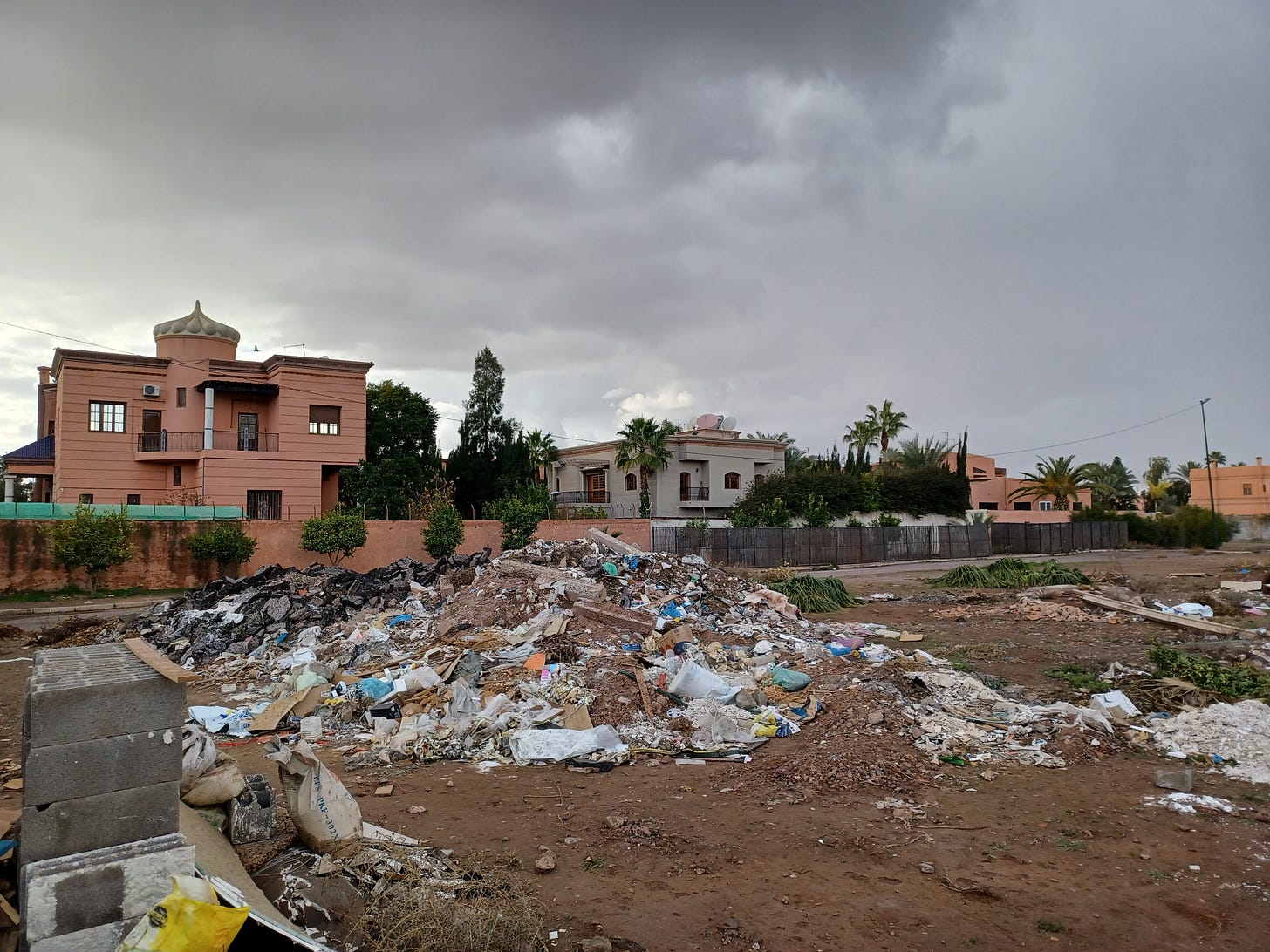 One thing that strikes a visitor to a lower income, or even middle income country (like Morocco) is the degree of “shabbiness” — the condition of the buildings, roads, and public spaces. Most important, how much litter is found on the ground. Having just arrived from Vienna, which is a remarkably well-kept city, the first thing that struck me on arrival in Marrakesh was the amount of plastic waste littering the streets and open spaces. Here’s a fairly typical sight: a mountain of trash in front of a rather palatial residence.
