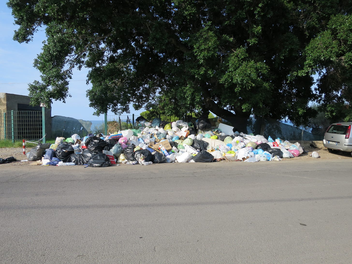 Let me tell you a story to illustrate this point. In 2016 we rented for several weeks a rural house in Sicily, in the vicinity of Palermo. The house was up on a hill, and the beach was a 10 minute walk down (or 15 minute climb back up). It all was wonderful, except on the way one had to go by a huge smelly mountain of garbage (see the photo below).
