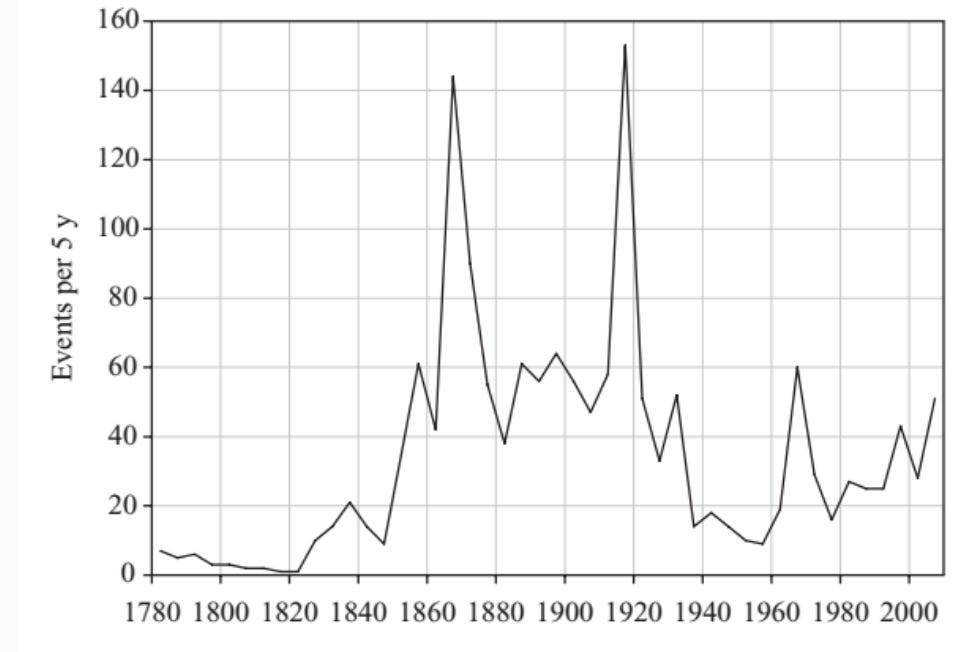 Following a suggestion that David Andolfatto (@dandolfa) made on Twitter, I used the quantitative metric that was established in my 2012 JPR article — the number of instability events per 5 years. Here’s the relevant figure from the article: