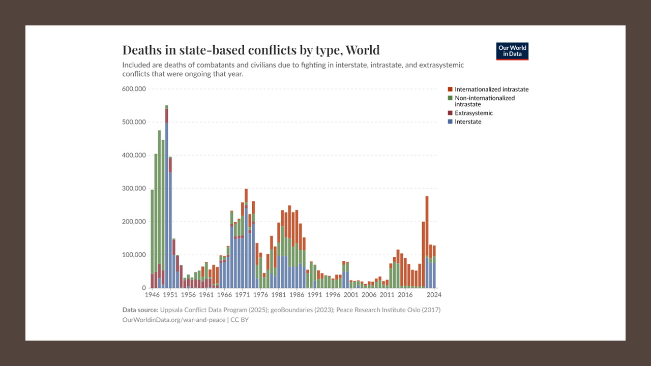 Unfortunately for the thesis proponents, post-2010 developments completely reversed the pre-2010 decline of war. The most recent report from the Uppsala Conflict Data Program documents a sharp increase in conflicts and wars. Here’s the graph from Our World in Data (incidentally, as I remember, Max Roser, the founder of OWID, was one of the most enthusiastic promoters of the Decline of War idea around 2010).
