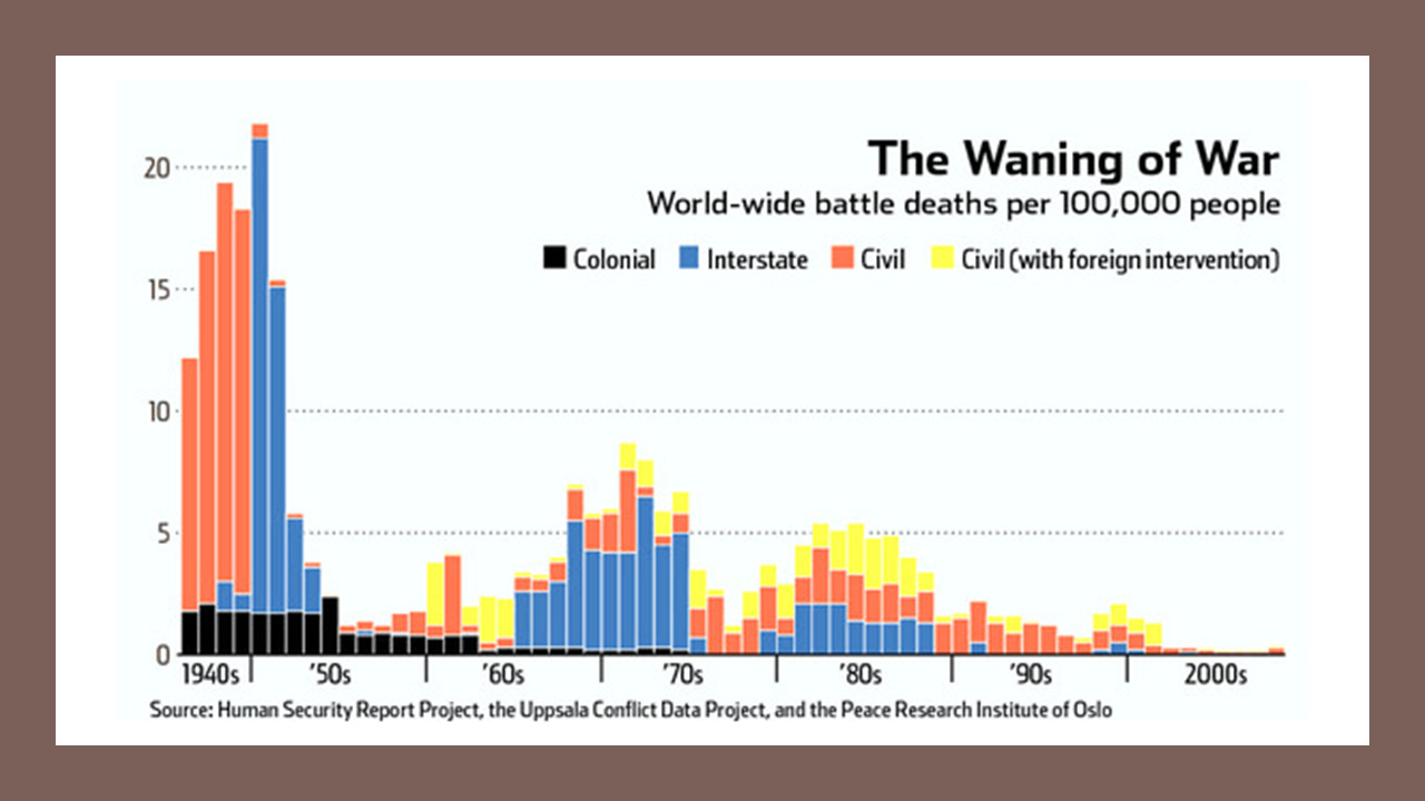 The key originator of the Decline of War thesis was the Human Security Report project, with a major report published in 2005. Steven Pinker in The Better Angels played a major role in popularizing the thesis. Here’s a typical example of data that were used to support the idea: