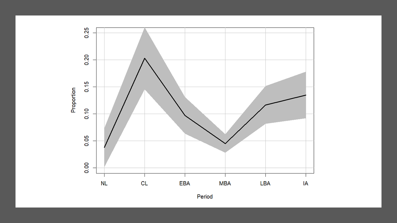 Trends in violent trauma in the ancient Middle East (includes the modern countries of Turkey, Iraq, Iran, Syria, Lebanon, Israel, and Jordan). On the y-axis: proportion of skeletons with violence-related injuries (means ± SE). Periods (all BCE) are NL: Neolithic (12000–4500); CL: Chalcolithic (4500–3300); EBA: Early Bronze Age (3300–2000); MBA: Middle Bronze Age (2000–1550); LBA: Late Bronze Age (1550–1200); and IA: Iron Age (1200–400). Source.